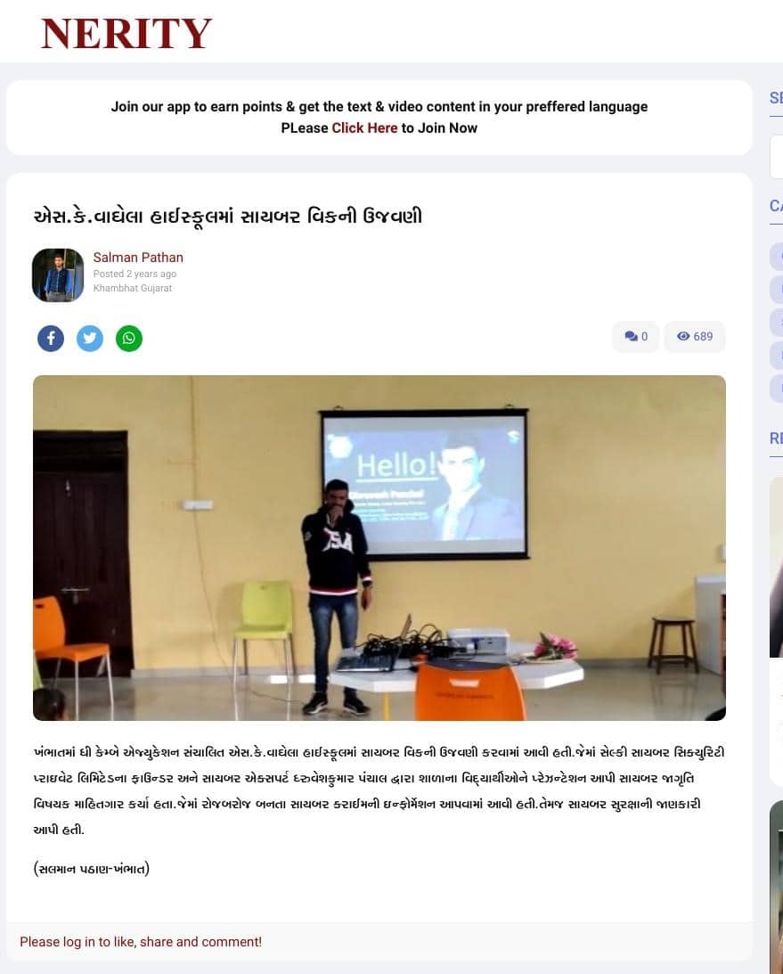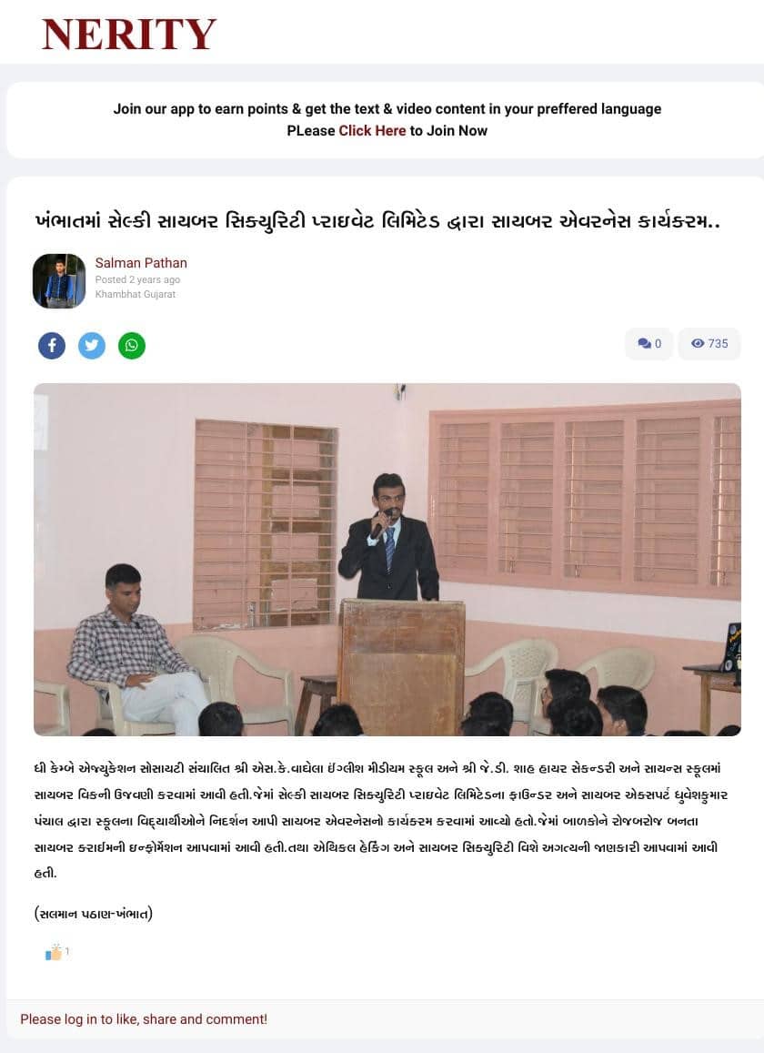 Dhruvesh Panchal, founder of Selkey Cyber Security Pvt Ltd, promotes cyber awareness and digital safety through seminars and scam prevention initiatives.